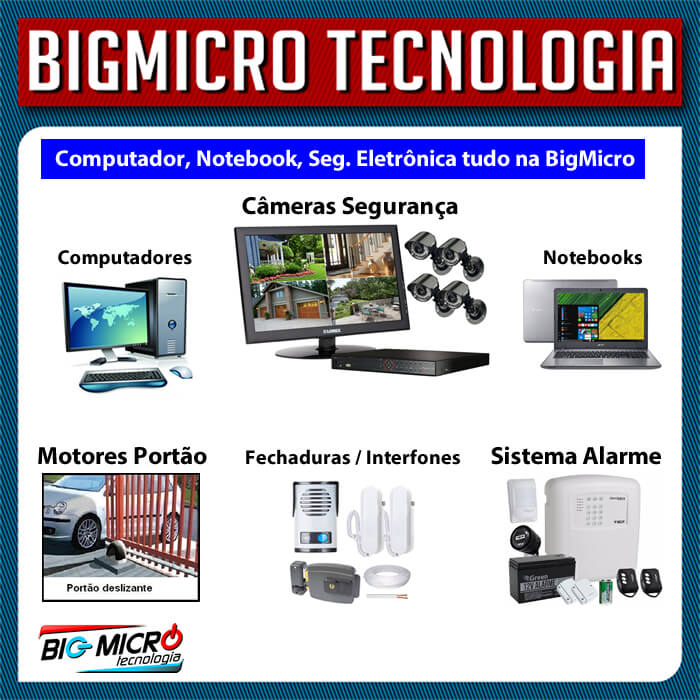 Explore as novidades! Ampliamos nossos horizontes para oferecer produtos e serviços em Segurança Eletrônica, Sonorização, Sistema Audiovisual, Eletroeletrônicos, Equipamentos Cozinha Industrial, Móveis Escolares, Material Esportivo e toda a linha pedagógica, venha se surpreender com a nova BigMicro. Faça parte da nossa Família!